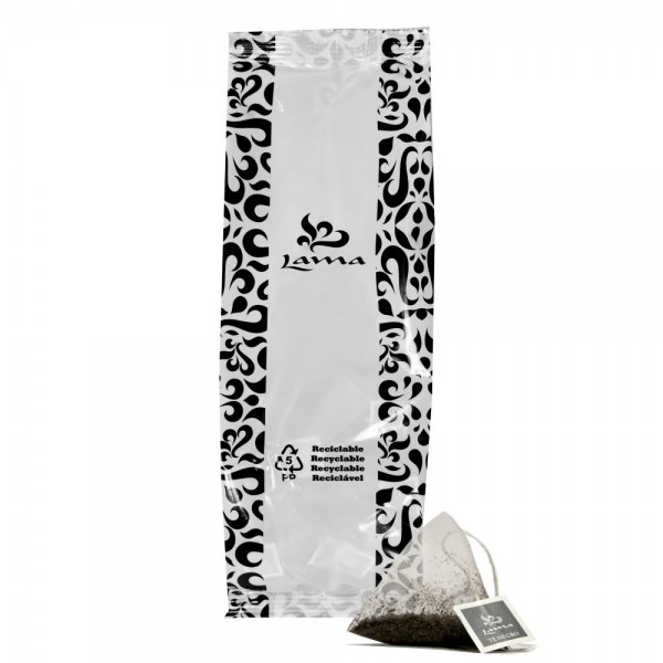 The pyramids are compostable, the label and the polypropylene bag are recyclable.
